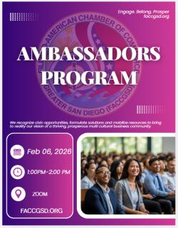 FACCGSD is the leader and catalyst for plans, strategies, programs and services that promote a favorable business climate, improve the quality of life, and support the orderly growth and development of our city and encourage and promote a positive, balanced, vital economy and preserve those unique qualities that are good for business and make Greater San Diego a very special place in which to live and work.